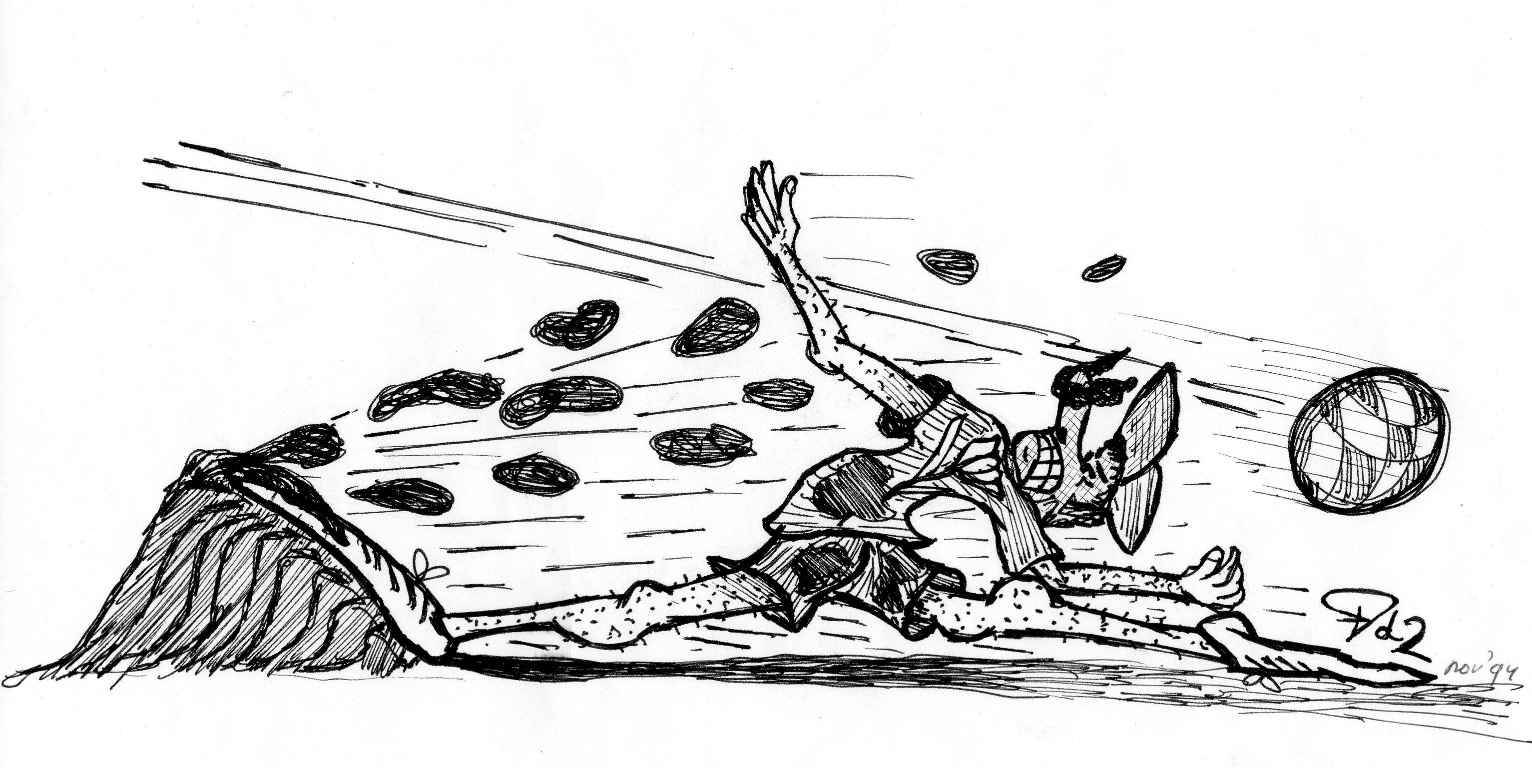 ‘Land Sliding’ of Football Player (drawing by Frank de Zanger)